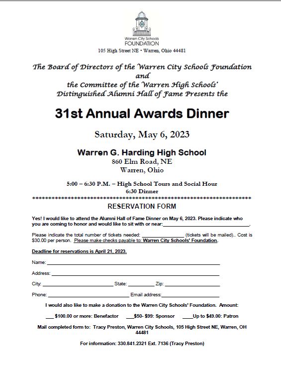 The 33rd Annual Awards Dinner of the Board of Directors of the Warren City Schools Foundation and the Committee of the Warren High Schools’ Distinguished Alumni Hall of Fame will be held Saturday, May 3, 2025, at Warren G. Harding High School, 860 Elm Road, NE, Warren, Ohio.