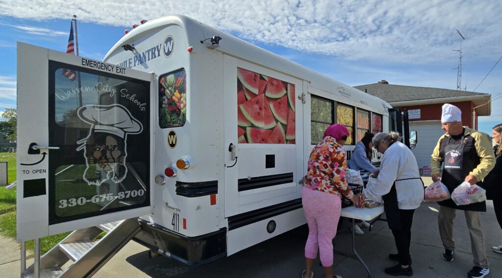 The pantry was stocked with non-perishable food items, fresh produce, and toiletries made available to the school district through various donations. The vehicle has been made available through donations from Community Bus Service, the United Way of Trumbull County and the Cafaro family.