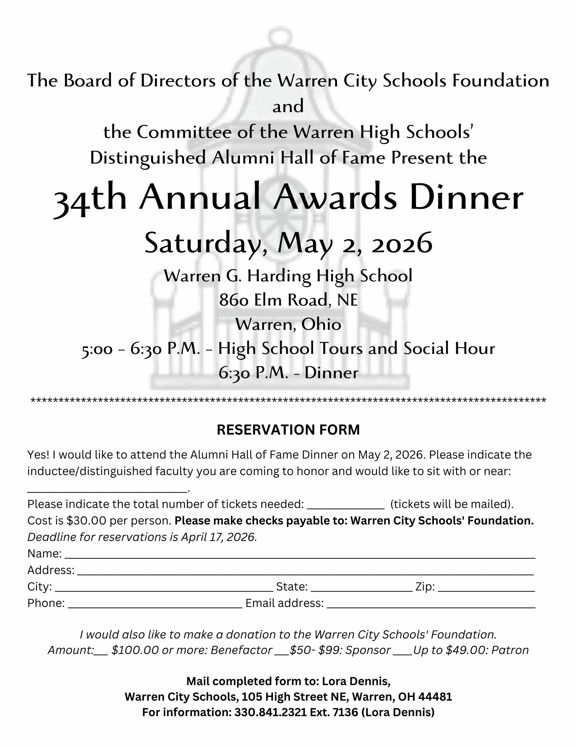 The 34th Annual Awards Dinner of the Board of Directors of the Warren City Schools Foundation and the Committee of the Warren High Schools’ Distinguished Alumni Hall of Fame will be held Saturday, May 2, 2026, at Warren G. Harding High School,  860 Elm Road, NE, Warren, Ohio.