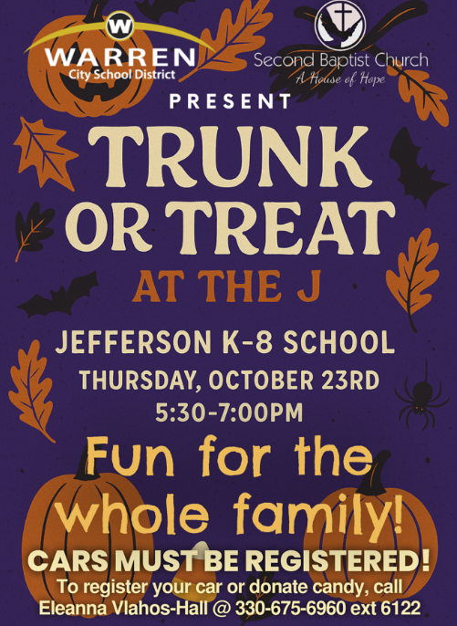 Our annual Trunk or Treat Event will Return Thursday, October 23 from 5:30-7:00. We hope that you will come out and join us!