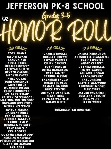 Grades 3-5 Honor Roll for the Second Nine Weeks Congratulations to the following Jefferson students in grades 3-5 for achieving honor roll for the second nine weeks. You Might Also Like Thanksgiving Lunch December 13, 2018 Waiver Day September 17 September 9, 2025 STEM Creativity March 15, 2022