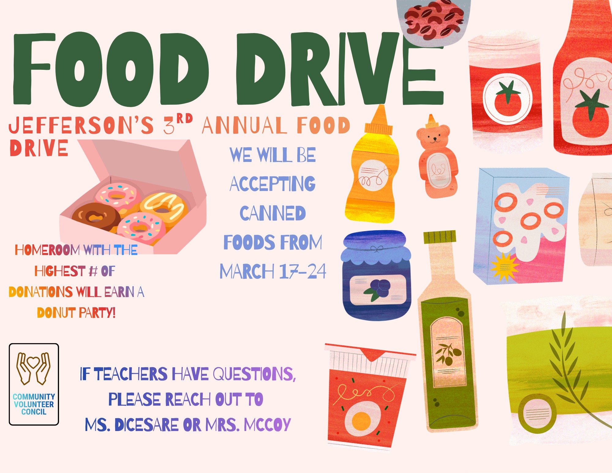 Our Jefferson student council will be collecting canned and non-perishable food items March 17-27. All items will be donated to the Community Food Council. The class that donates the most items will win a donut party!