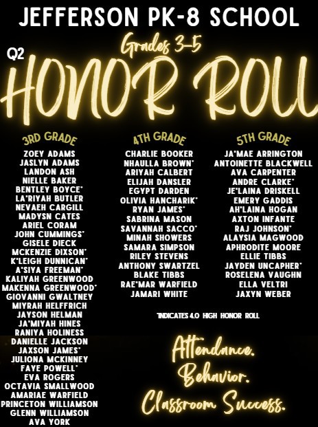 Congratulations to the students in grades 3-5 who made the honor roll for the past nine week grading period. Their hard work and dedication definitely paid off. Great job everyone!