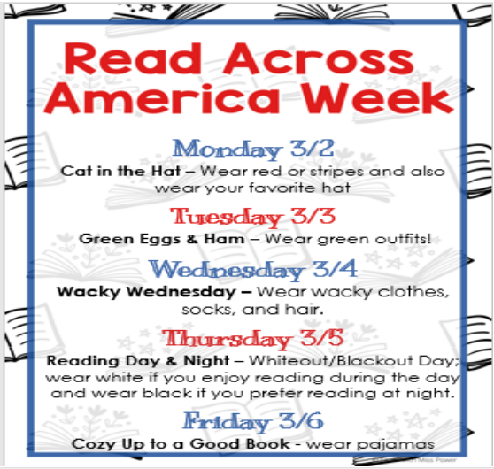 So grab a book, pick out your spirit wear, and join us as we read, dress up, and celebrate the magic of books together. Let’s make Read Across America Week one to remember! πŸ“–βœ¨