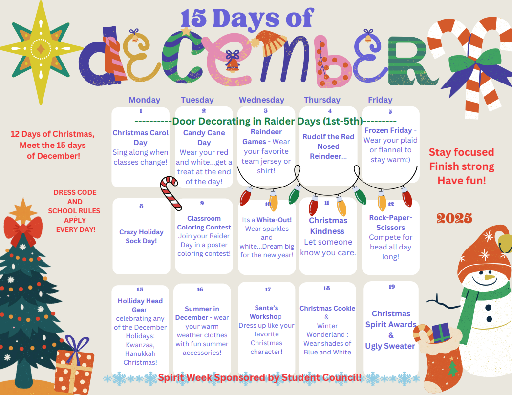 The month of December can be intense with the end of the semester. The WGH School Social Climate Committee along with the Student Council have prepared some fun winter themed events for the month. The calendar of these themed days is attached.